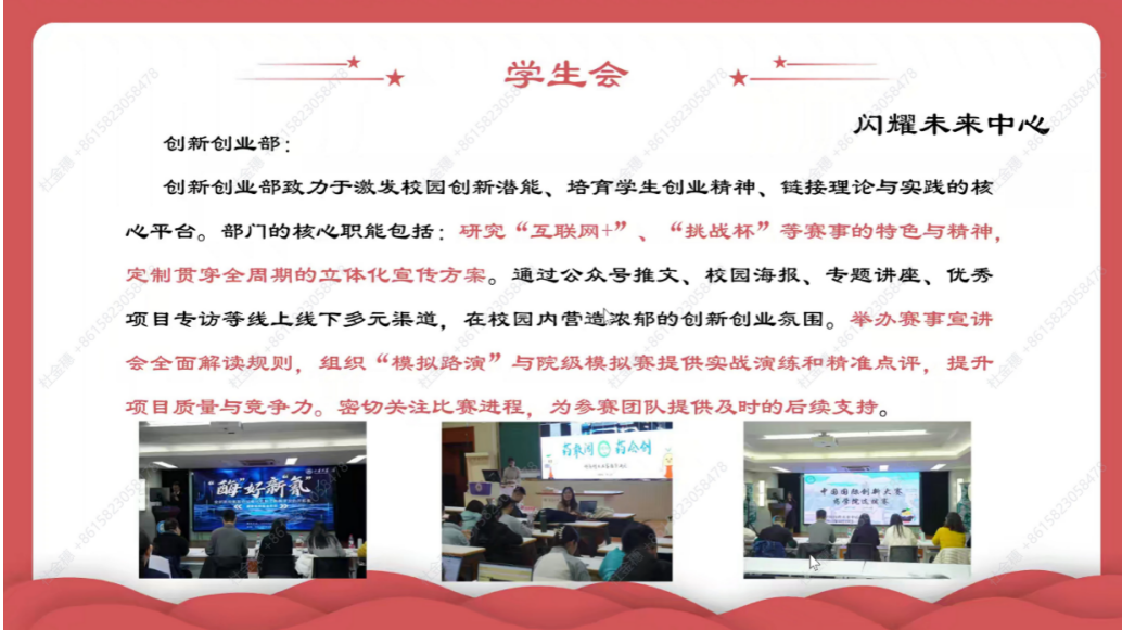 紧接着,刘懿瑄围绕学生工作进行了详尽介绍。她以自己带领的“药圃听风,史海拾贝”团队暑期实践活动为例,让新生了解了尹德瑛和赵彦伟两位教授。随后,她通过图片与文字相结合的方式向新生们讲解了药学院学生会的各个中心及其下设部门的分工职能和开展的丰富活动,让新生们初步了解了学生会组织的整体情况,激发了他们对学生会的浓厚兴趣。