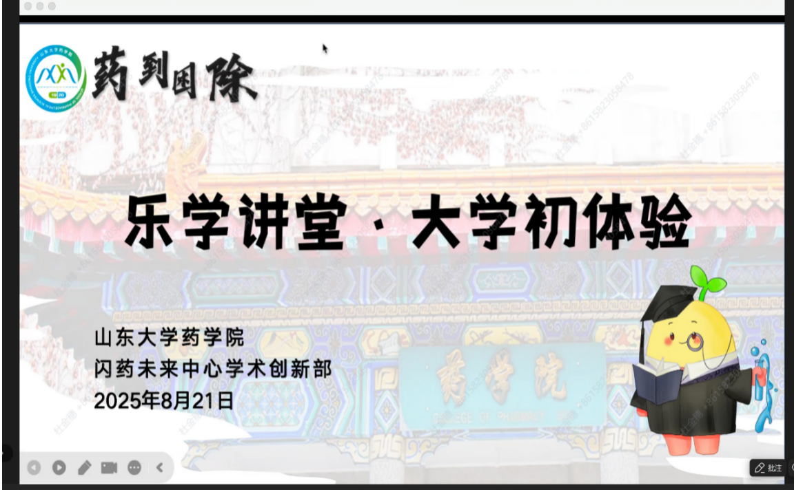 为发挥朋辈互助优势,帮助新生更快适应大学生活,汲取学习经验,8月21日,药学院闪药未来中心学术创新部举办“药到困除”——乐学讲堂·大学初体验线上讲座。讲座邀请2024届优秀毕业生贾双旭和2023级本科生刘懿瑄担任主讲人,商钧皓主持,药学院2025级全体新生参与。