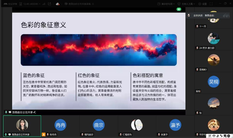 同时,队员们还分享了在唐卡工坊参观与文化市场考察中积累的实践经验。队员们指出,由于唐卡文化扎根于特定的地域与社会环境,有着独特的本土文化语境,所以在开展相关的调研活动时尊重本土语境、建立信任关系是深入获取信息的关键。此外,队员们认为,唐卡不仅是宗教艺术,更是鲜活的文化实践。在当代社会文化发展的大背景下,唐卡的转型发展不仅使得莲花等传统符号获得了新的传播契机与生命力,还使其在新的时代语境下能继续发挥独特的文化价值。
