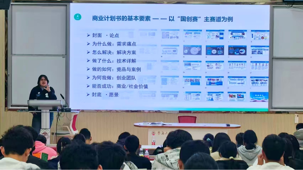 随后,梁雨晨以“国创赛”主赛道为例,讲解了商业计划书的撰写规范和方法。她从计划书的框架搭建、核心要点提炼到内容细节打磨,都进行了深入浅出的阐述。此外,她还围绕本科生科研的相关事宜为大家带来一份内容详实的“药宝创新创业通关攻略”。通过案例和资源展示,她让同学们直观地看到了创新想法转化为实际成果的可行路径,切实增强了同学们在未来主动参与创新创业大赛的积极性与自信心。