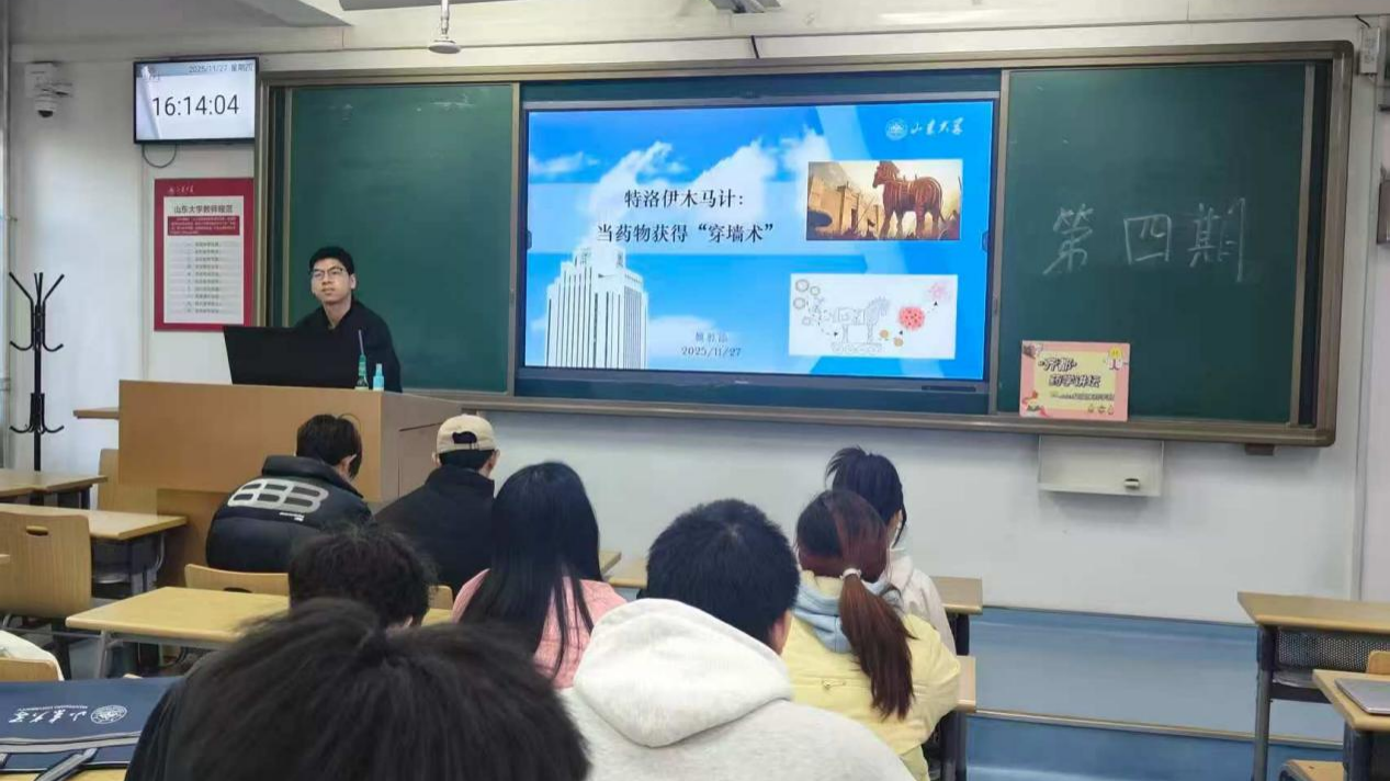 第三位演讲人姚胜添以《特洛伊木马计:当药物获得“穿墙术”》为题,先阐释了“特洛伊木马计”的典故——希腊联军藏匿于巨大木马中潜入特洛伊城并取胜,再详细介绍了基于该原理衍生的细胞穿膜肽、铁载体抗生素、铋基药物等尖端技术。