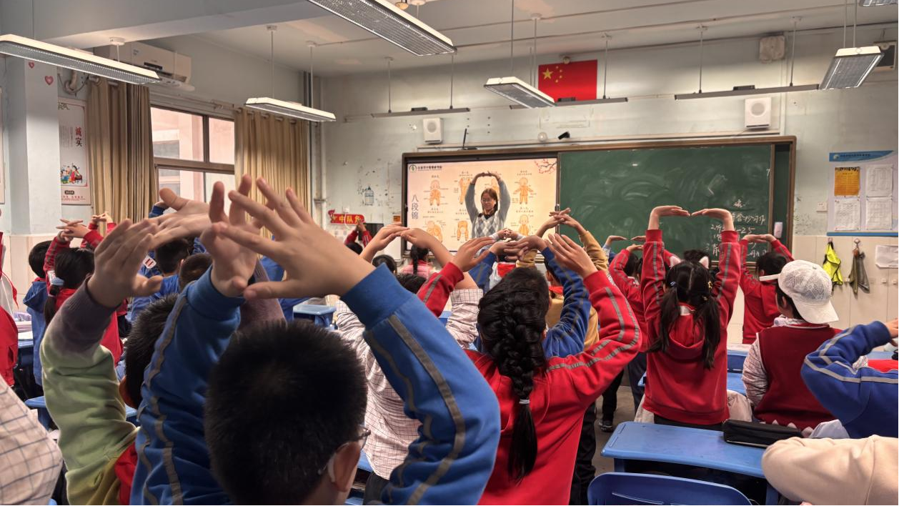 实践体验环节氛围热烈,她在讲台上示范并带领同学们学习了八段锦。从起势到收势,她逐一拆解动作要领,耐心纠正姿势细节,并鼓励大家通过规范练习强身健体、疏通经络。同学们精神饱满、认真学习,在一招一式中体会传统养生功法的独特价值,既锻炼了身体,也强化了坚持锻炼的意识。