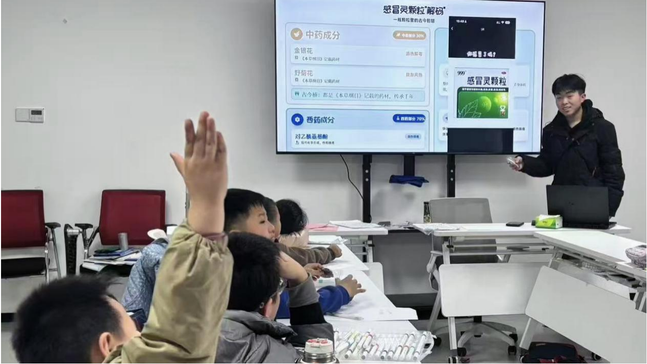 随后,他运用通俗易懂的语言,向孩子们讲解了郎中诊脉的原理及药食同源的理念。讲解过程中,他结合感冒灵颗粒这一常见药物,详细介绍了金银花、野菊花等中药成分及其功效。此外,孩子们也积极互动,主动分享了家中长辈切脉的经历,并结合自身感冒、咳嗽时的用药感受提出问题。他则逐一耐心解答,进一步补充了相关的药学知识,并着重强调了安全用药的原则。