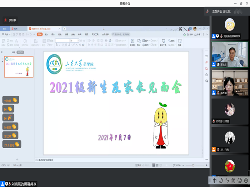 9月7日晚,药学院通过线上平台举办了2021级本科新生家长见面会,院党委书记王秋生、院长鞠建华携领导班子全体成员出席会议。学院优秀教师代表郭秀丽,院学工办主任兼团委书记李冬,辅导员周现民、吕淑良、王灿,新生辅导员刘晓燕、本科教务秘书李龙骁、学校学生心理健康教育与咨询中心路翠艳等老师参加会议。会议由王秋生主持。