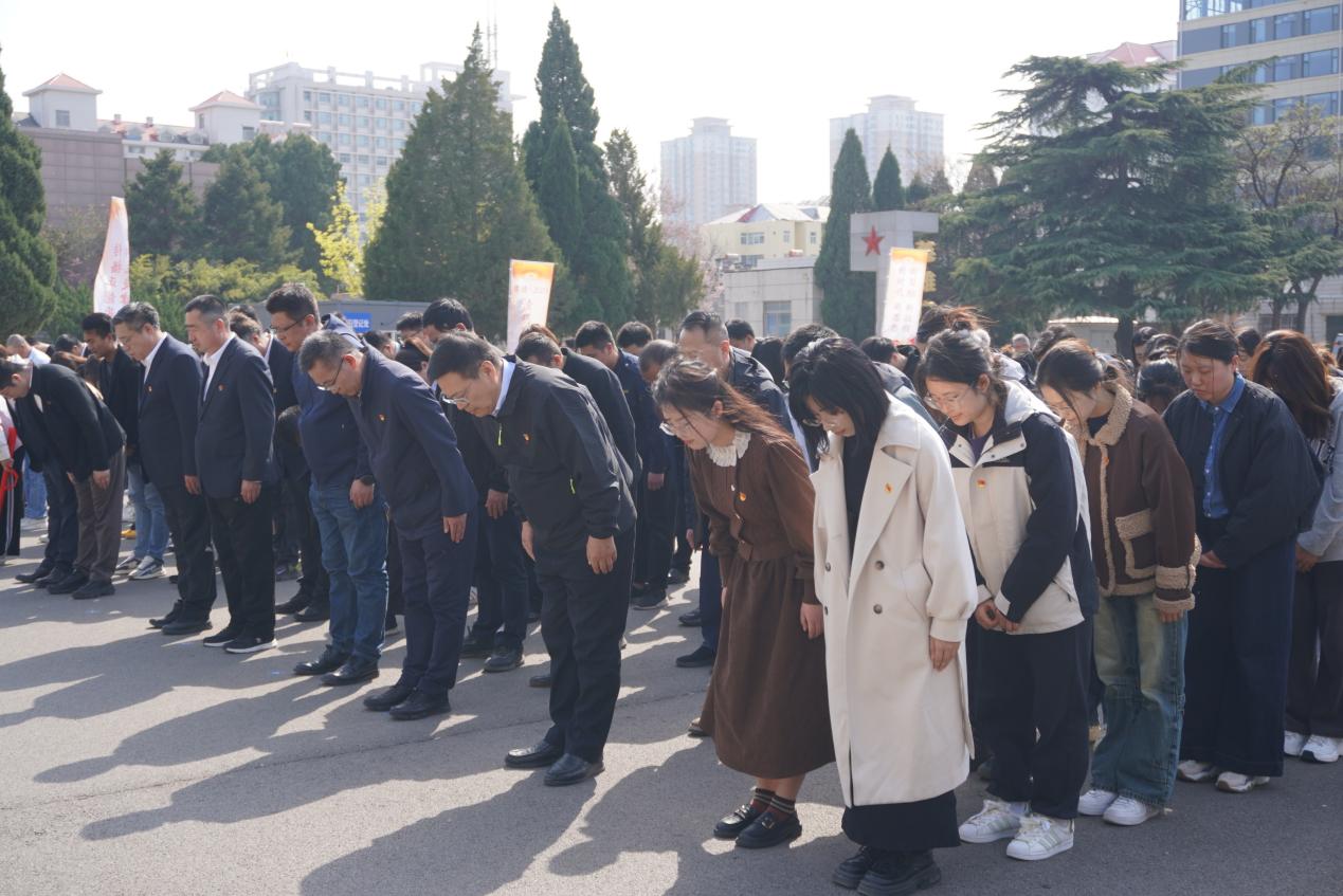 在英雄广场中央,全体师生党员整齐列队,开展团体祭扫活动,向革命英雄先烈默哀致敬。