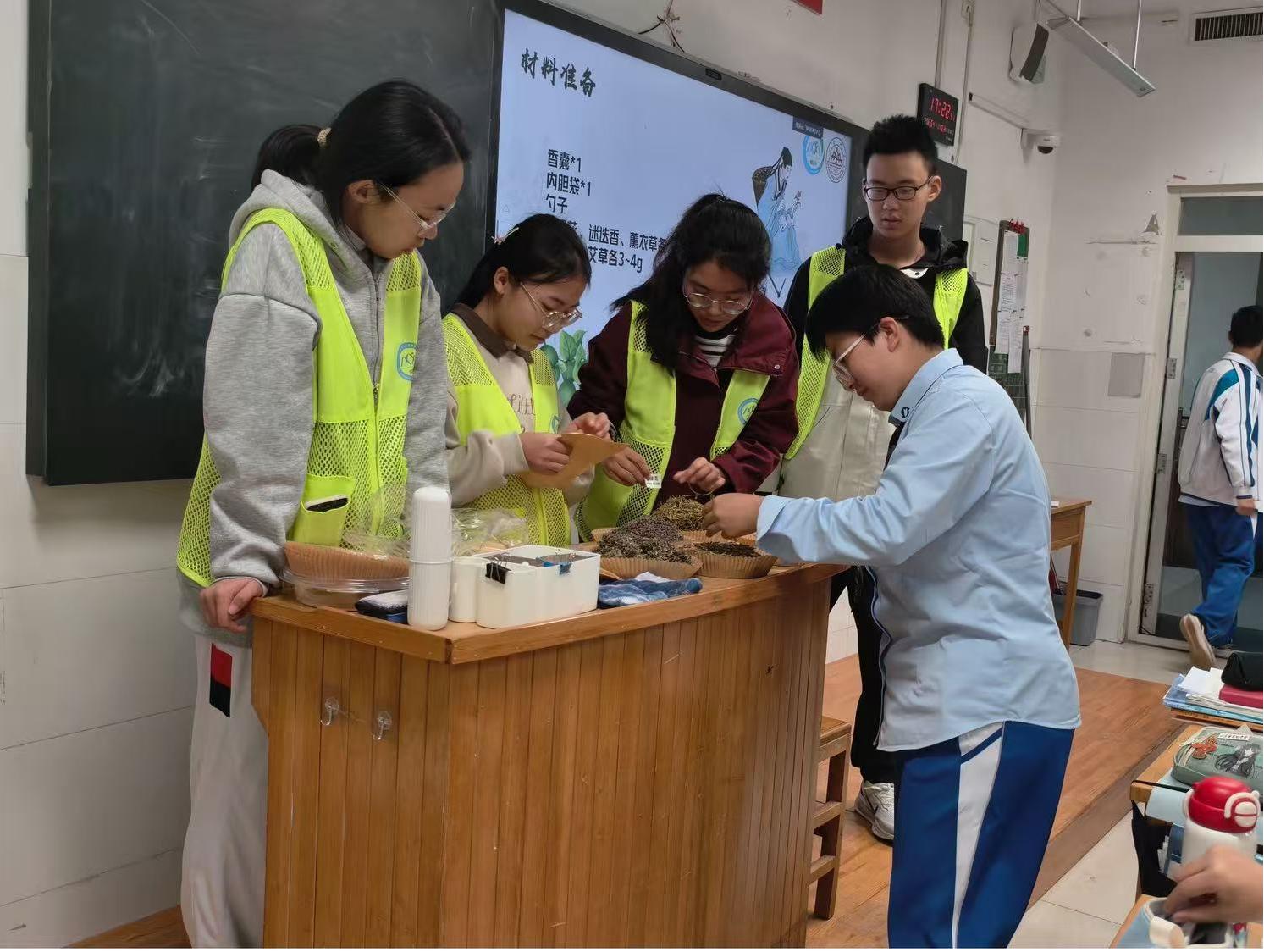 宣讲结束后,山东省实验中学的同学们被分为香囊制作组和药膳馒头制作组,在药学院师生指导下同步开展实践活动。香囊制作组学习了“香药同源”的相关知识以及香囊的起源,了解了艾叶、薄荷、丁香等中药材的特性、功效及辨识方法。随后,该组同学亲手调配了柠檬草、薰衣草、迷迭香、艾草、金银花五种香料,制作出兼具疏通经络与安神助眠功效的中药香囊,在实践中认识药材特点、体验劳动乐趣。