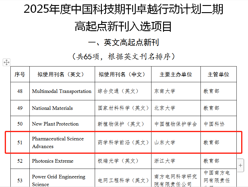 12月5日,中国科技期刊卓越行动计划二期入选项目公布,经项目申报、资格审查、答辩评审、结果公示等环节,山东大学主办的Pharmaceutical Science Advances《药学科学前沿(英文)》成功入选“2025年度中国科技期刊卓越行动计划二期高起点新刊项目”。