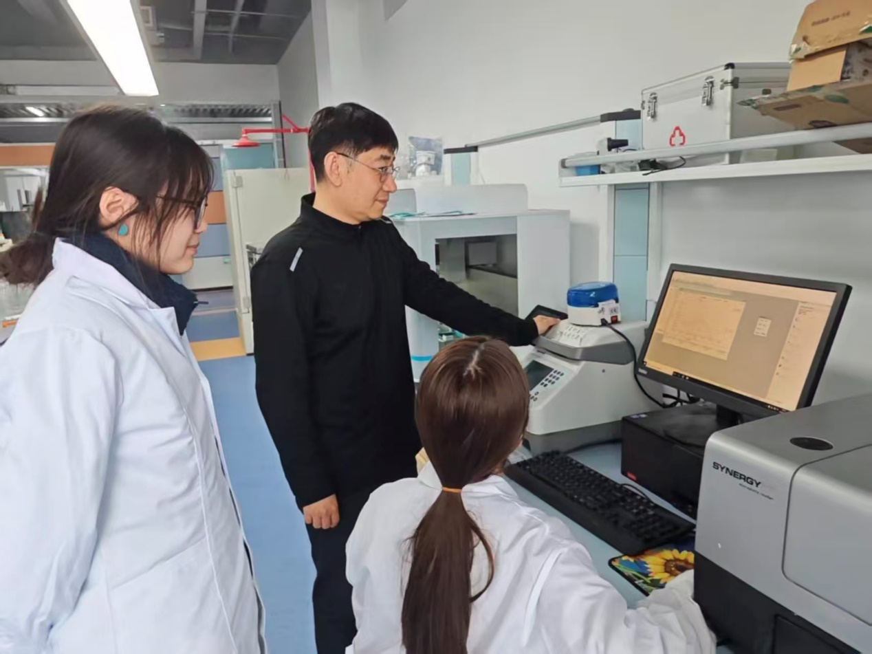 在国家大学科技园,生物药物与糖类药物研发团队生举正教授与学生讨论实验结果,交流科研进展,共同制定新学期科研目标。