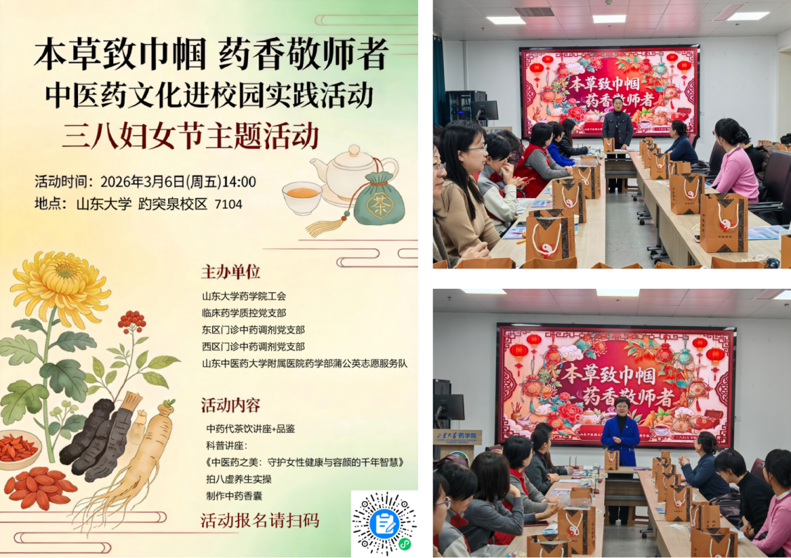 春风送暖,巾帼生辉。在“三八”国际妇女节来临之际,为致敬辛勤耕耘在教学、科研一线的巾帼师者,传递节日关怀与温暖,3月6日下午,药学院举办“本草致巾帼 药香敬师者”主题活动。活动由药学院工会,山东中医药大学附属医院临床药学质控党支部、东区门诊中药调剂党支部、西区门诊中药调剂党支部及药学部蒲公英志愿服务队联合举办。药学院工会女工委员李慧副教授主持活动,药学院和校内女教职工代表参加活动。